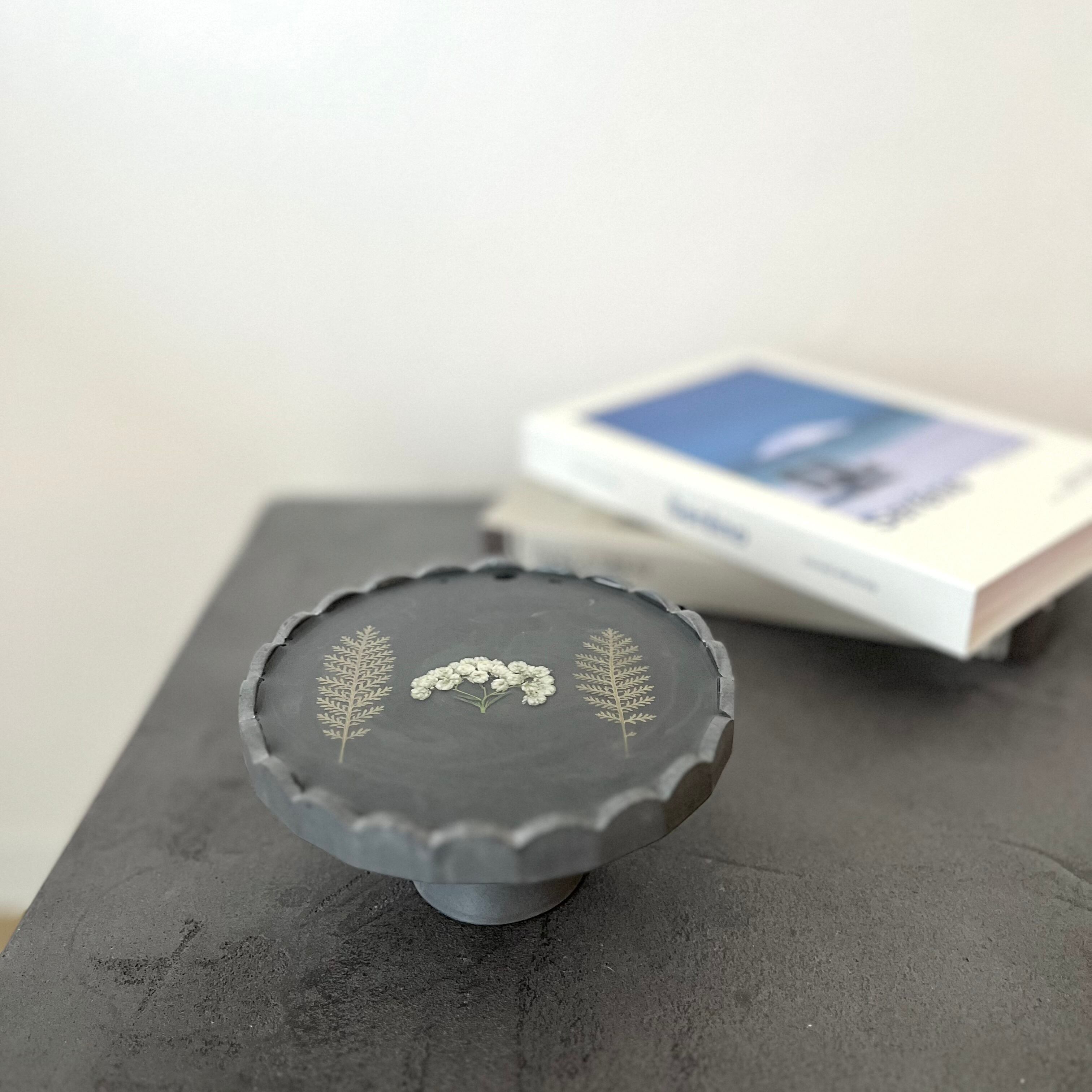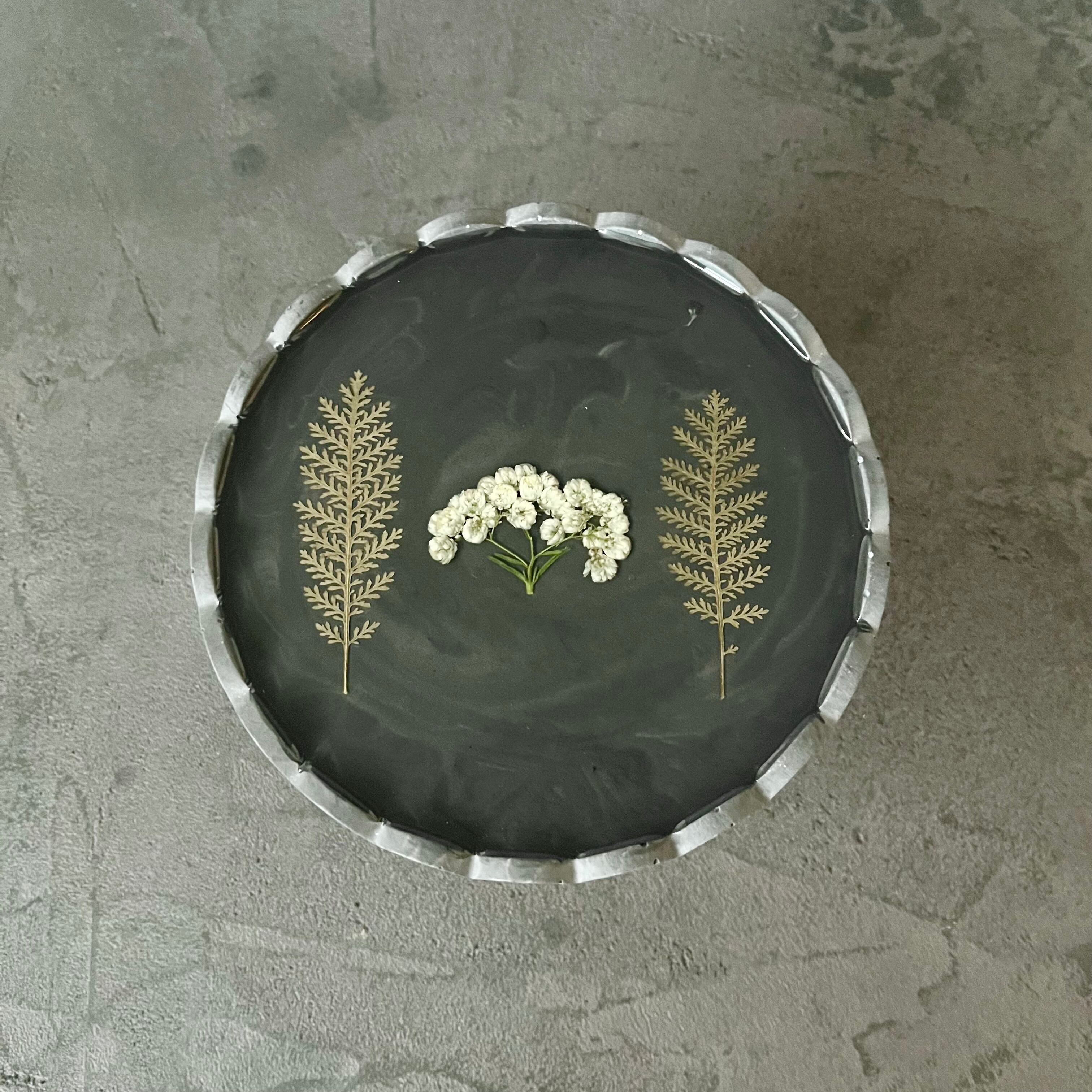お皿部分には、ライスフラワーとシルバーリーフの押し花を封じ込めています。
