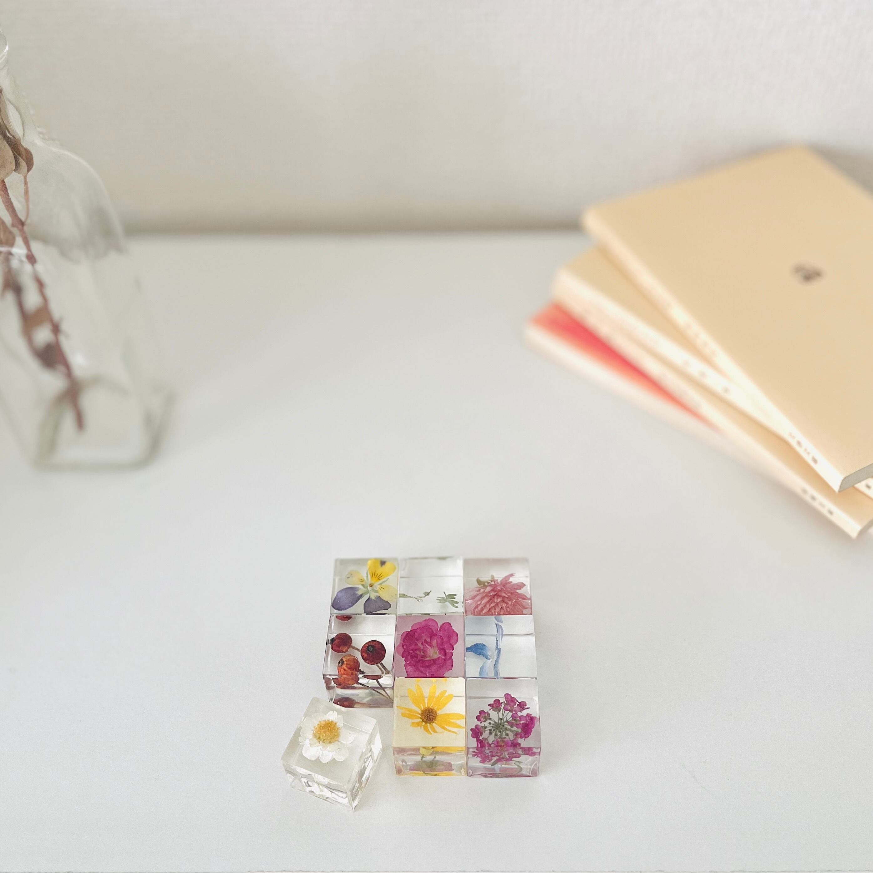 キューブには、ドライフラワーが閉じ込められており、ひとつひとつはまるで植物標本のよう。